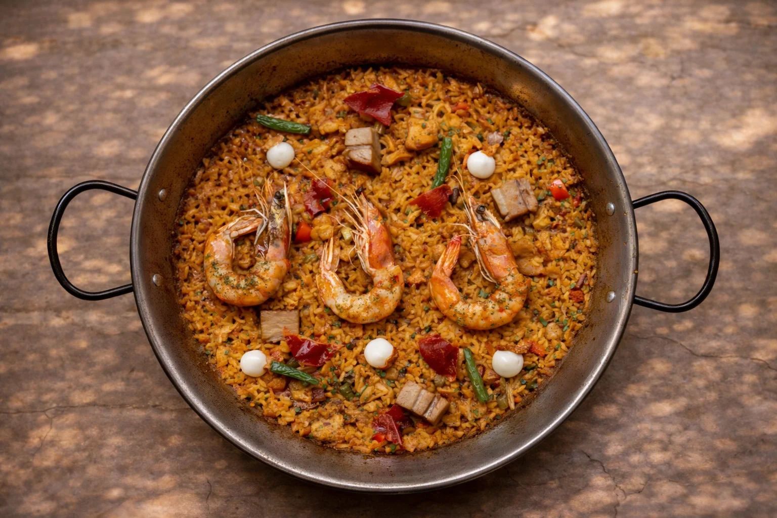 Bomba rice from Valencia. Saffron from La Mancha. Cooked to order — from the classic Mixta to the ink-black Paella Negra.